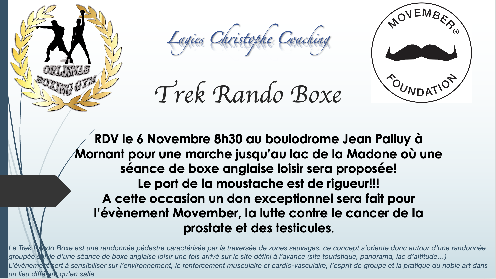 Ce programme dispense des séances pugilistiques adaptées, visant toute la patientèle qui se sont vus prescrire une activité physique adaptée sécurisée et encadrée par un professionnel, toutes les personnes souffrant d’affections longue durée, de maladies chroniques. (Obésité, HTA, Diabète, Asthme, Grossesse, Cancer…)