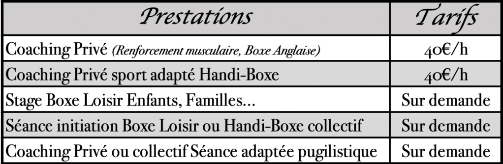 J’œuvre pour le développement du sport adapté Handi-Boxe en me déplaçant à domicile chez des personnes handicapées afin de leur proposer une séance sur ce thème, mais également au près d’autres associations accueillant ce public-là.Ayant obtenu ma certification Prescri Boxe (sport sur ordonnance), je propose, sur demande, un suivi 100% personnalisé et sur mesure prenant en compte l’âge, l’état de santé, le niveau, la pathologie et aussi les objectifs de la personne à accompagner.